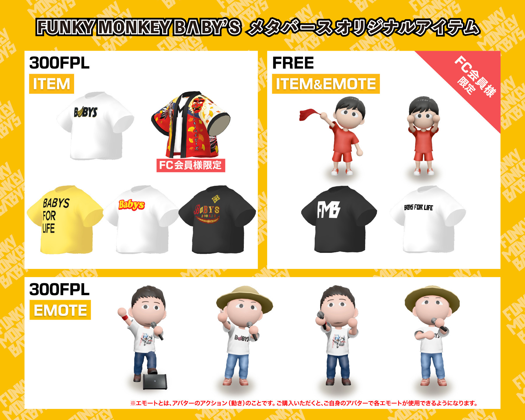 「Fanpla Market」では、FUNKY MONKEY BΛBY'S OFFICIAL FANCLUB会員限定の無料アイテムも登場!自身のアバターをカスタマイズさせてお楽しみください!